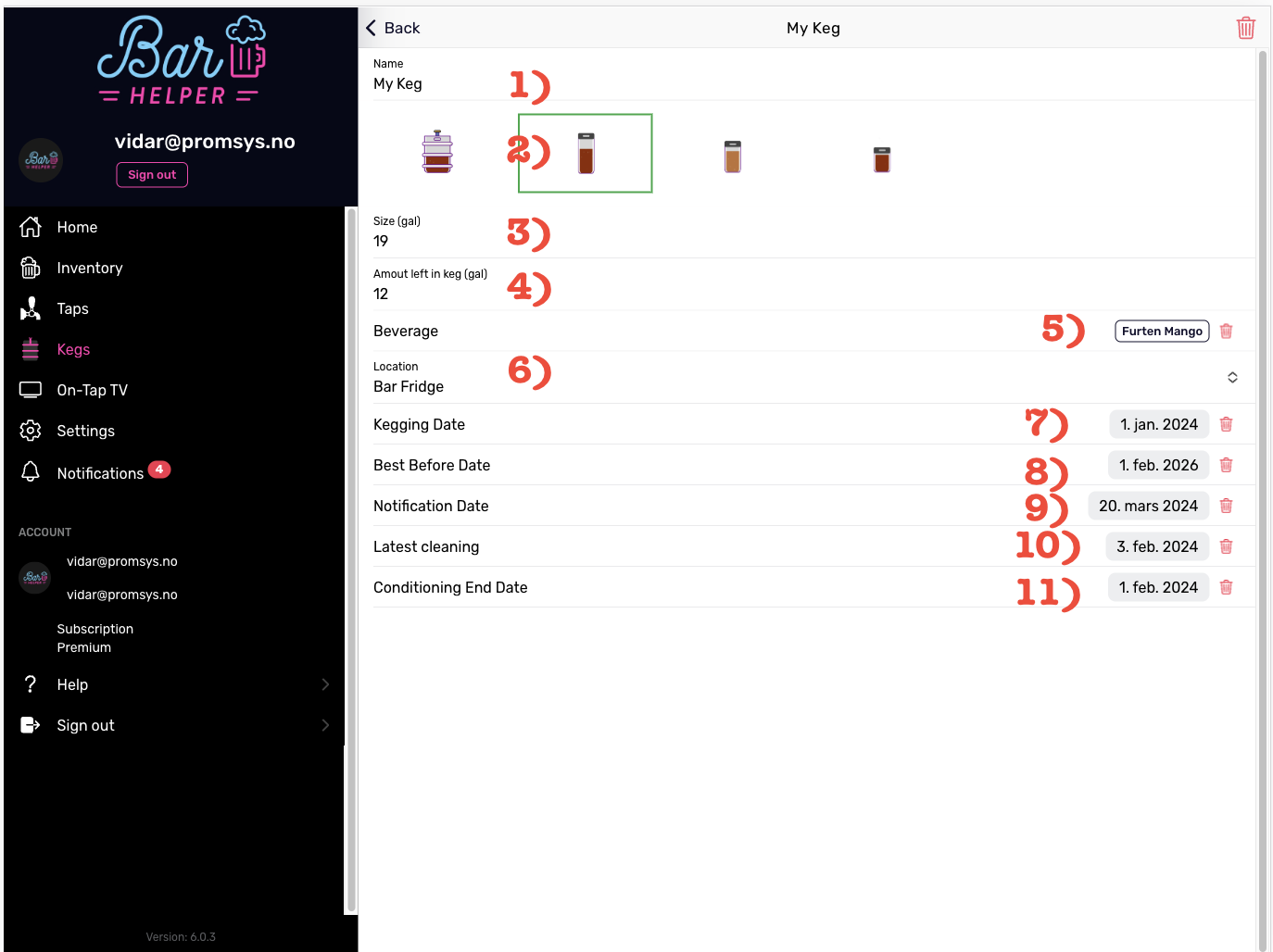 4. **Amount left in keg**: The remaining amount of beverage in the keg. This is used to calculate when the keg will be empty. If you connect a Keg Monitor to the keg, this field is automatically filled out.