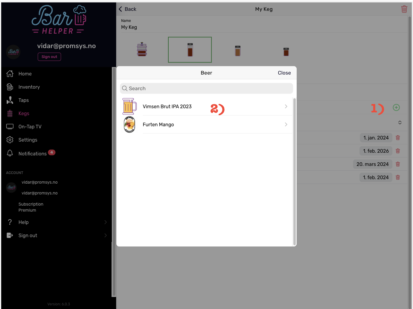 3. "In the overview, you can see the type of keg you have and the remaining amount of beverage in each keg.