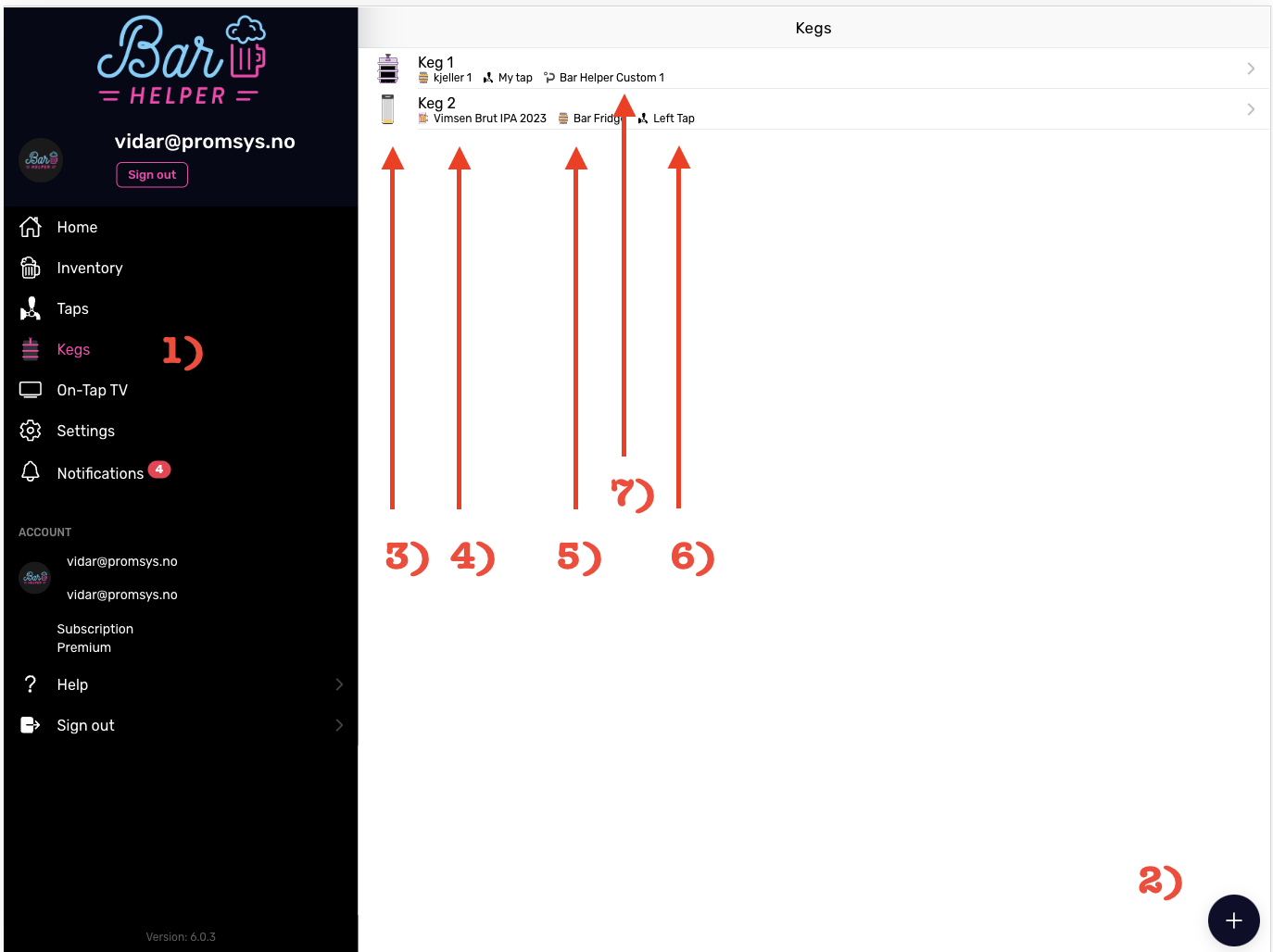 To add a keg, press the black (+) icon at the bottom right on the list page (refer to point 2 above).